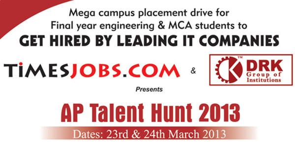 Fresher Mega Campus Placement Drive @ �AP Talent Hunt 2013� in Andhra Pradesh About Company Name: AP Talent Hunt 2013 Job Details Education: Engineering/MCA Experience: Freshers - 2013 Location: Andhra Pradesh Walk-in On 23rd & 24th Mar 2013 Between AM to PM @ Andhra Pradesh Job Description Only Candidates from registered institutes are eligible to participate in this Event. For details call 040-23254420. (10am to 5pm only) Click Here For More Details