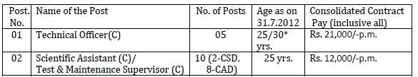 Educational Qualifications Post No.1: (for 1 year - Extendable by one more year based on organizational needs) A First Class Engineering Graduate in ECE/EEE/Instrumentation/C&I with 60% marks in aggregate. Candidates with minimum one year post qualification experience in relevant areas at Sites will be preferred. Post No.2: For CAD : (for 1 year - Extendable by one more year based on organizational needs) First class Diploma in ECE/EEE/Instrumentation Engineering with 60% marks in aggregate. Candidates with minimum one year post qualification experience in relevant areas at Sites will be preferred. For CSD : (for 2 years) A First class Diploma in Electronics Engineering with at least 60% marks in aggregate. Should have minimum one year post qualification experience in the field of Testing/Maintenance of Control & Instruments/ Electronics & Communication. How To Apply Eligible candidates may appear for interview along with all originals pertaining to qualifications, experience, proof of date of birth, caste etc., with a set of photocopies and recent passport size photograph. The Walk-in-interview will be held on 05.08.2012 (SUNDAY ) from 0930 hrs., to 1300 hrs., at ECIL-Zonal Office, Panagal Building, Ground Floor, IA, Jeenis Road, Saidapet, Chennai-15 (Telephone No. 044-24349085). Click Here For Detailed Notification